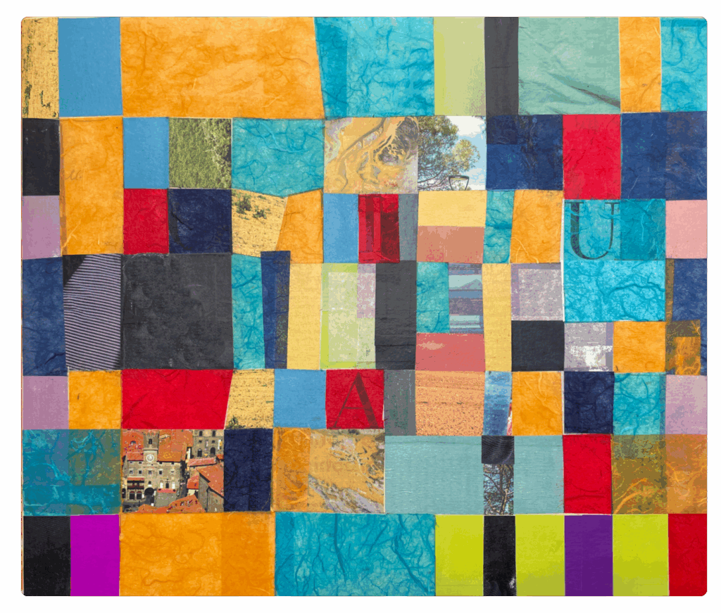 Collé 2025 GRAFIK, Collage In giro senza pensieri, Collage auf Holz 08102025, 28 x 33 cm I timbri delle vocali, Collage auf Holz 13102025, 28 x 33 cm